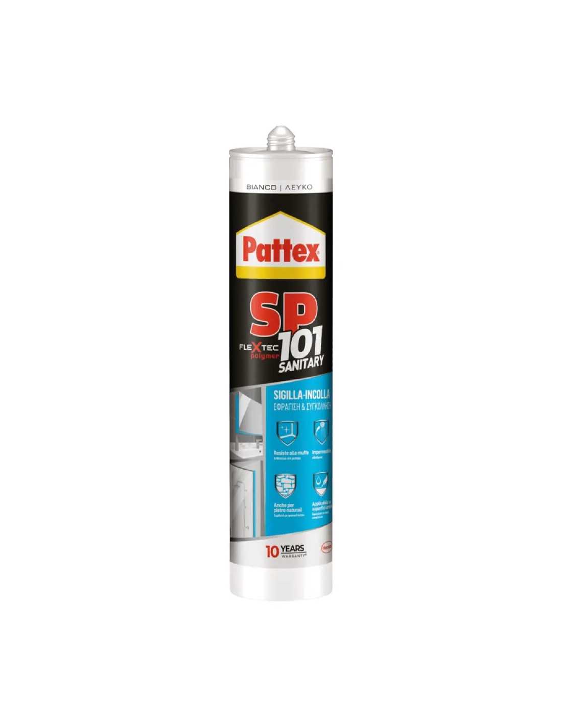 SIGILLANTE NEUTRO 'PATTEX SP101 SANITARY' è un adesivo super performante a base di speciali polimeri, ideale per bagni e sanitari per sigillature elastiche. Verniciabile, senza silicone, si può applicare su superfici umide ed a basse temperature. Adatto anche per pietra naturale e per incollare e sigillare specchi. Antimuffa, contiene fungicida ed è resistente all'acqua.