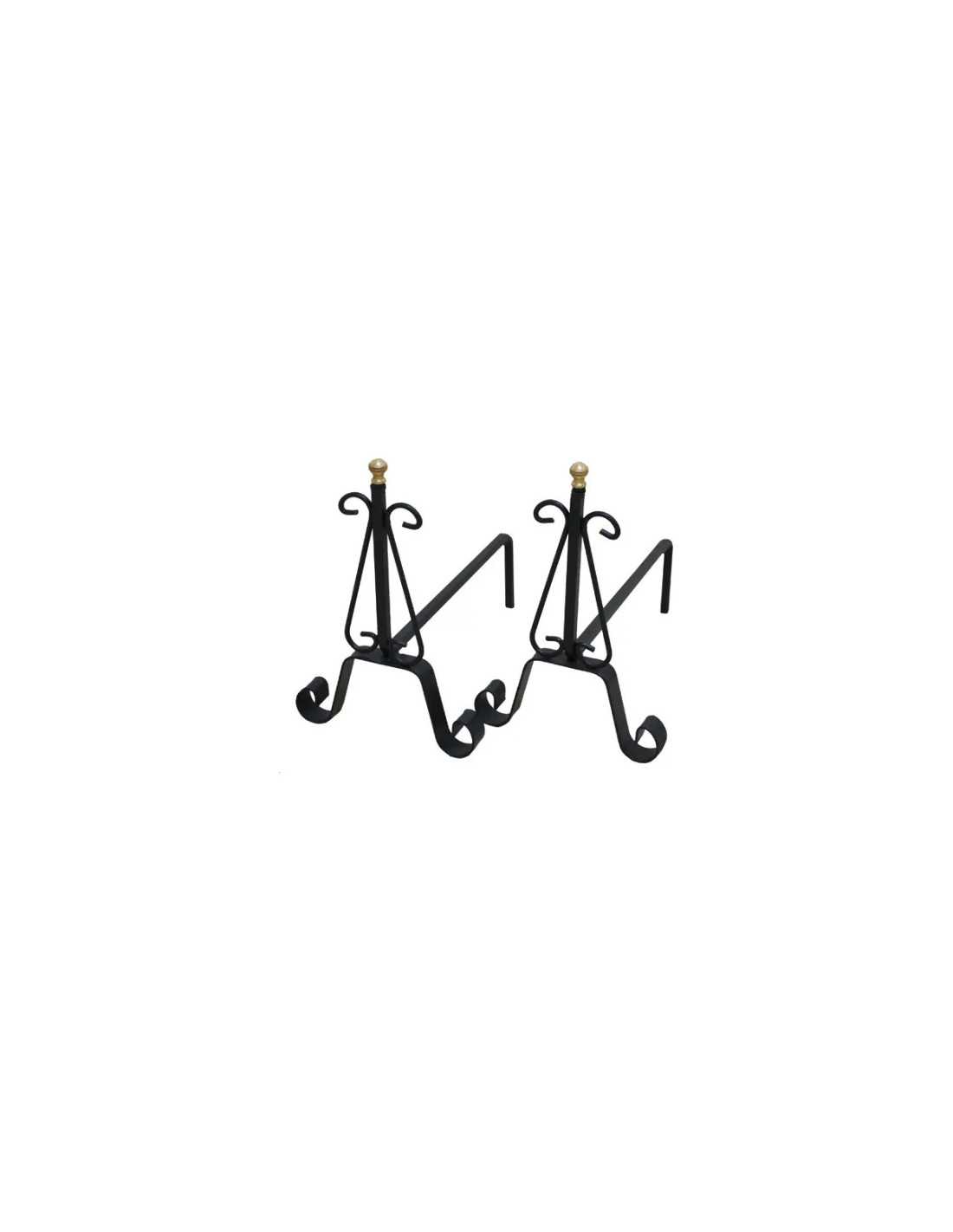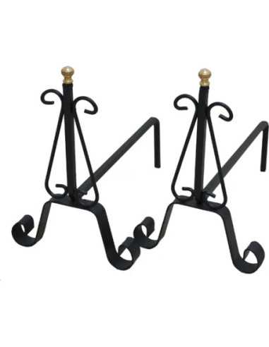 Alari in ferro battuto CF.2PZ per migliorare la circolazione dell'aria nel camino e evitare rotolamenti accidentali dei ceppi in combustione. Realizzati in ferro verniciato da 12 mm con pomelli in ottone Ø 20 mm per una maggiore stabilità e facilità di spostamento.
