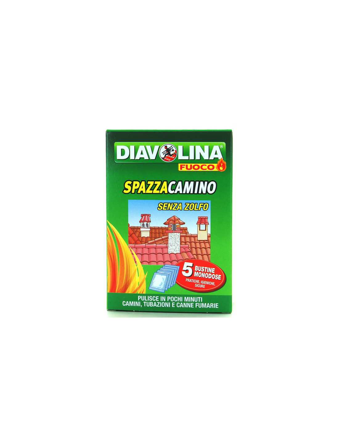 ANTIFULIGGINE SPAZZACAMINO BUSTINE DIAVOLINA FUOCO è un potente distruttore chimico di fuliggine, con un'azione catalitica che previene incendi e migliora la combustione. Ideale per la pulizia di camini e canne fumarie, queste bustine monodose sono pratiche, igieniche e sicure. Senza zolfo, garantiscono una pulizia efficace e sicura.
