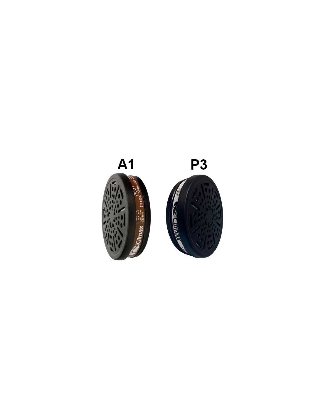 Filtri Climax P3 per respiratori 761, adatti per la ritenzione di particelle di fumi di saldatura, vernici a solvente, protezione contro batteri e virus. Certificati CE e conformi alle normative europee.