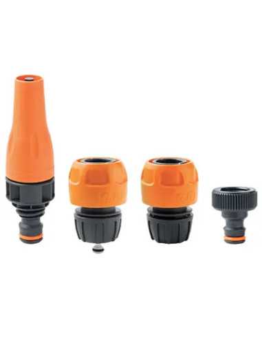 LANCIA KIT 4 GF è un pratico kit con getto regolabile ed attacco rapido, ideale per tubi da 12 a 15 mm di diametro. Include 1 raccordo portagomma Aquastop, 1 raccordo portagomma 'aperto' e 1 presa al rubinetto con filettatura femmina da 3/4". Con una portata massima di 12 Lt/min a 4 bar, questo kit è perfetto per l'irrigazione del giardino.
