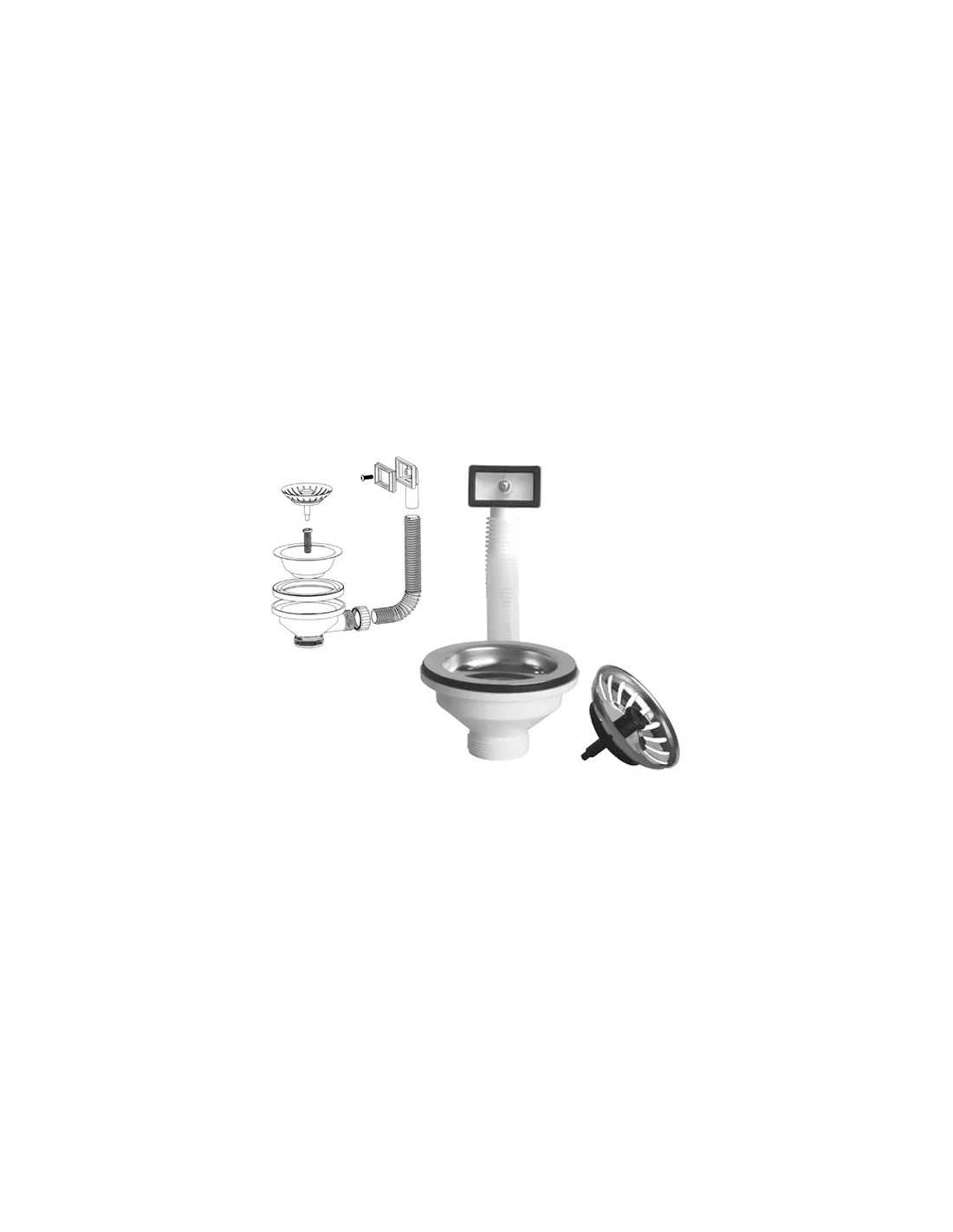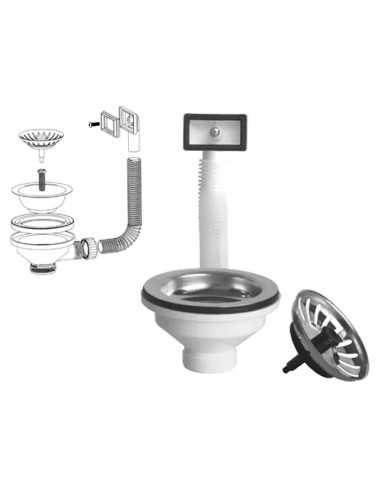 Pilette SCATTINO Art. 470 ideali per lavelli con troppo pieno, realizzate in polipropilene resistente. Completo di tubo flessibile, mostrina rettangolare, cestello e gattinara in acciaio inox 18/10. Raccordo inclusi per un'installazione semplice e veloce.