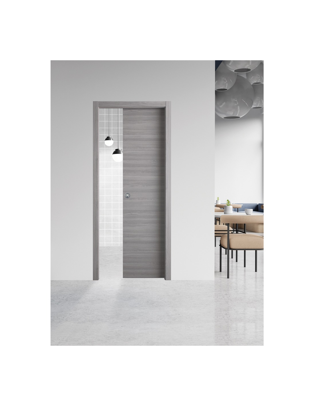 Porta scorrevole in MDF con telaio reversibile, isolamento acustico e kit maniglie incluso. Ideale per installazioni pratiche e moderne.