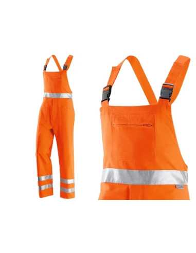 Abbigliamento Alta visibilità: pantalone con pettoriana in cotone e poliestere, bretelle regolabili, tasche multiple e bande retroriflettenti. Ideale per lavori in ambienti ad alta visibilità.