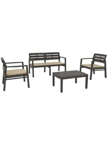 Il set resina Java Antracite è la soluzione perfetta per arredare il tuo spazio esterno con stile e funzionalità. Realizzato con una struttura in resina effetto doghe in legno resistente agli agenti atmosferici, questo set è composto da due poltrone, un divano con comodi cuscini e un tavolo coordinato.