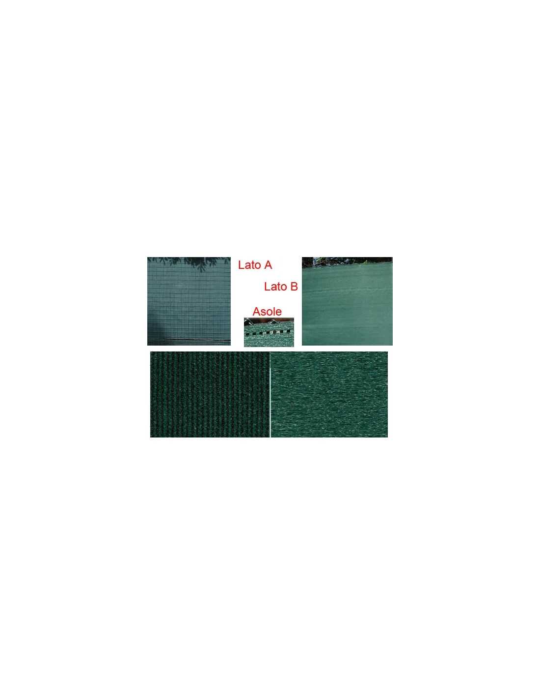 Stuoia ombra Exclusive Privacy Arrigoni, realizzata con doppio tessuto a telaio per una copertura alla luce del 90%. Composta da un tessuto a maglia annodata che forma la base robusta e un tessuto a fili slegati che chiudono i micro fori, consentendo il passaggio dell'aria. Lati di due tonalità di verde con asole per facilitare l'installazione.