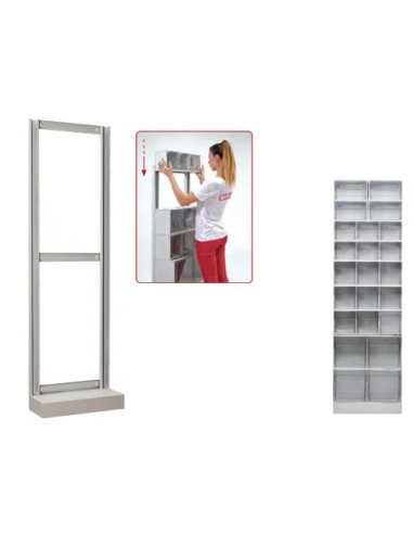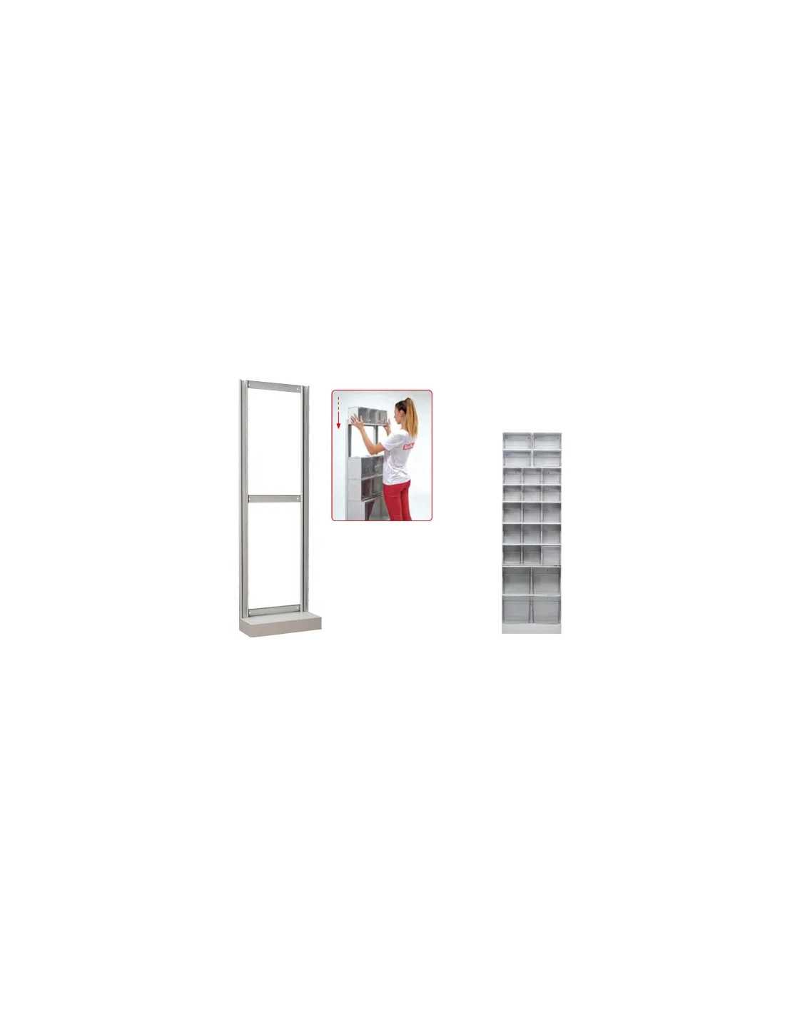 Telaio espositore per cassettiere CB Pensile MP195, realizzato in lamiera elettrosaldata e verniciato a forno in polvere epossidica di colore grigio. Ideale per organizzare e visualizzare prodotti in modo ordinato e professionale.