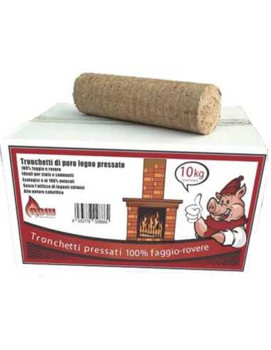 Tronchetto di legno di faggio e rovere, ecologico al 100%, pronto all'uso in scatola da 10kg circa. Ideale per stufe, caldaie a legna, forni da pane e da pizzeria grazie al suo alto potere calorifico e basso contenuto di umidità.