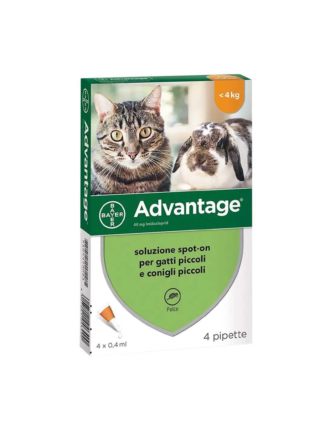 ANTIPARASSITARIO 'ADVANTAGE SPOT-ON' è un efficace trattamento antiparassitario per gatti e conigli, formulato con principi attivi che impediscono alle pulci di attaccarsi, pungere e nutrirsi di sangue. Inoltre, ha un effetto larvicida sulle larve delle pulci presenti nell'ambiente. Confezione pratica con 4 pipette monodose.