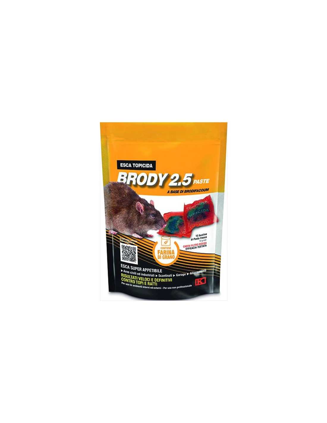 L'esca fresca topicida Brody 2.5 Paste KOLLANT è la soluzione ideale per combattere topolini domestici e ratti grigi, sia negli ambienti esterni che interni. Grazie alla sua formulazione avanzata e alla composizione specifica, garantisce risultati veloci e definitivi. Questo prodotto, completo di contenitore per esche, offre un'efficacia senza compromessi nel controllo di infestazioni da roditori.