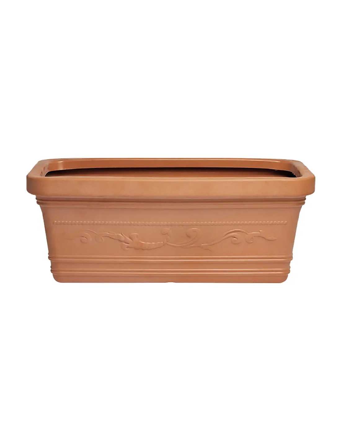 La fioriera rettangolare 'Prestige' è realizzata in resina resistente agli agenti atmosferici, dal design color terracotta con fantasia festonata. Ideale per abbellire il tuo spazio esterno con stile e praticità.