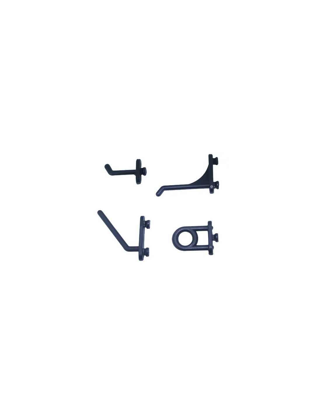 Ganci in nylon neri con anello grande, ideali per organizzare utensili su pannelli forati.