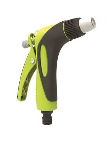 IDROPISTOLA A LANCIA PLASTICA GOMMA GF è un'innovativa pistola per l'irrigazione con impugnatura rivestita in morbida gomma antiscivolo. Dotata di leva di regolazione posteriore per bloccare il getto e regolare la portata da fine ventaglio polverizzato a getto diritto. Ideale per un'irrigazione precisa e comoda. Include anche un pratico innesto rapido per una maggiore facilità d'uso.