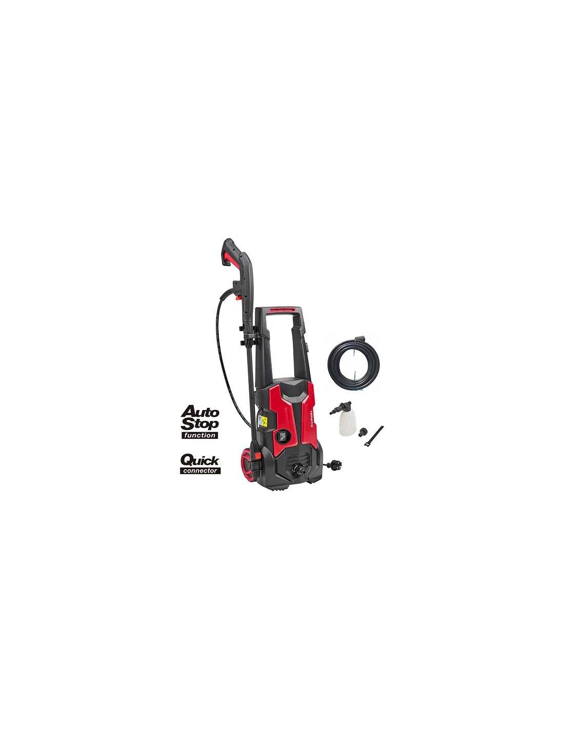 Una potente idropulitrice con una pressione massima di 120 bar e una portata massima di 390 L/h. Dotata di tubo ad alta pressione con attacco rapido, sistema di auto stop, carrello con manico ergonomico e accessori inclusi come pistola, lancia con ugello regolabile e diffusore detergente.