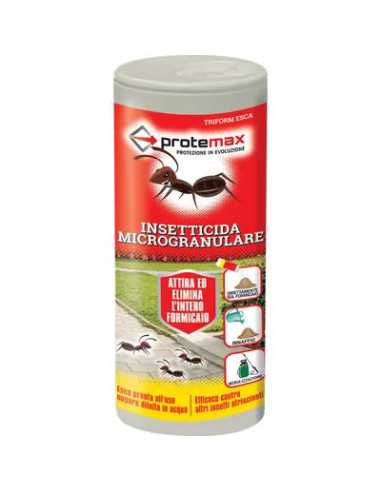 Insetticida Formiche Microgranuli PROTEMAX: un esca altamente appetibile per le formiche, efficace fino a 3 mesi dall'applicazione. Ideale per il controllo di varie specie di insetti sia all'interno che all'esterno delle abitazioni.