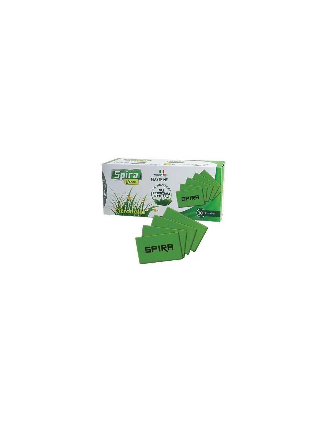 Piastrine Profumate antizanzare per elettroemanatori Spira Green. Confezione contenente 30 piastrine insetticide arricchite con oli essenziali al profumo di citronella.