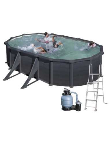 Piscine ovali GRE Granada Kit Prov GF con pareti in acciaio galvanizzato laccato colore grafite resistente alla corrosione. Gli accessori inclusi sono skimmer di superficie, pompa di filtraggio a sabbia, scaletta di sicurezza e telo di basamento. La stabilità è garantita dai profili superiori e dai supporti verticali. Si consiglia di realizzare una piccola soletta di calcestruzzo perfettamente livellata per ancorare la piscina.