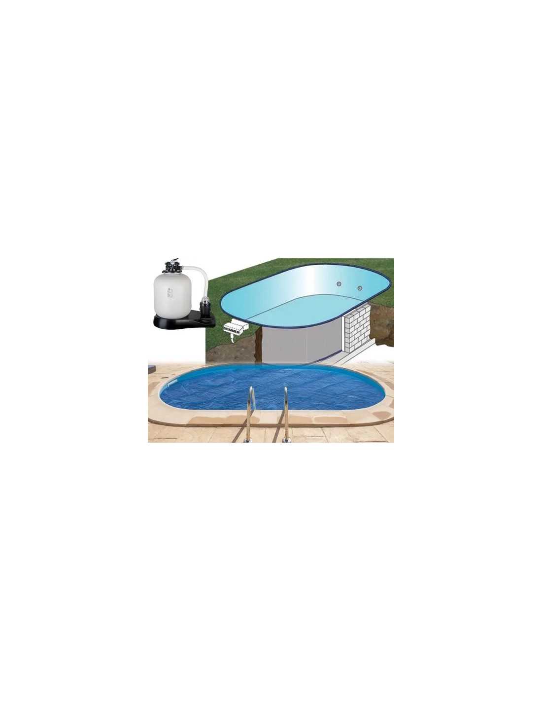 Piscina interrata ovale della linea GRE Madagascar KP EOV 7059, con pareti in acciaio e profili orizzontali. Dotata di telo interno in PVC trattato anti-UV, skimmer di superficie, pompa di filtraggio a sabbia inclusa, scaletta di sicurezza e tappeto per il suolo in polietilene. Ideale per chi cerca un prodotto resistente e completo per il proprio giardino.