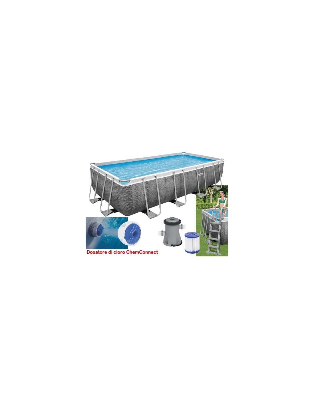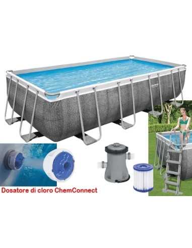 Piscina rettangolare Power Steel Rattan BestWay, ideale per godersi momenti di relax in giardino. Dotata di struttura resistente in metallo trattato antiruggine e pareti in PVC stampate effetto rattan. Include pompa per filtraggio dell'acqua, dosatore chimico ChemConnect per una distribuzione costante del cloro, scaletta di accesso e telo di copertura. Facile da montare e utilizzare per un'estate all'insegna del divertimento!