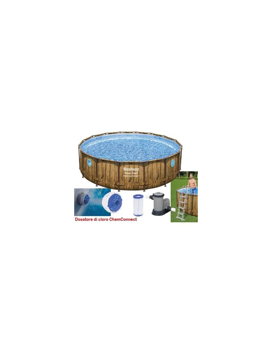 Piscine tonde con telaio Rattan Bestway 56725, ideali per un divertimento fresco e rilassante in giardino. Dotate di pompa filtraggio, dosatore chimico Chemconnect per una pulizia costante, e accessori come telo di copertura e scaletta di accesso. Con pareti in PVC stampa rattan e 4 oblò swim vista, sono perfette per godersi l'estate in totale relax.