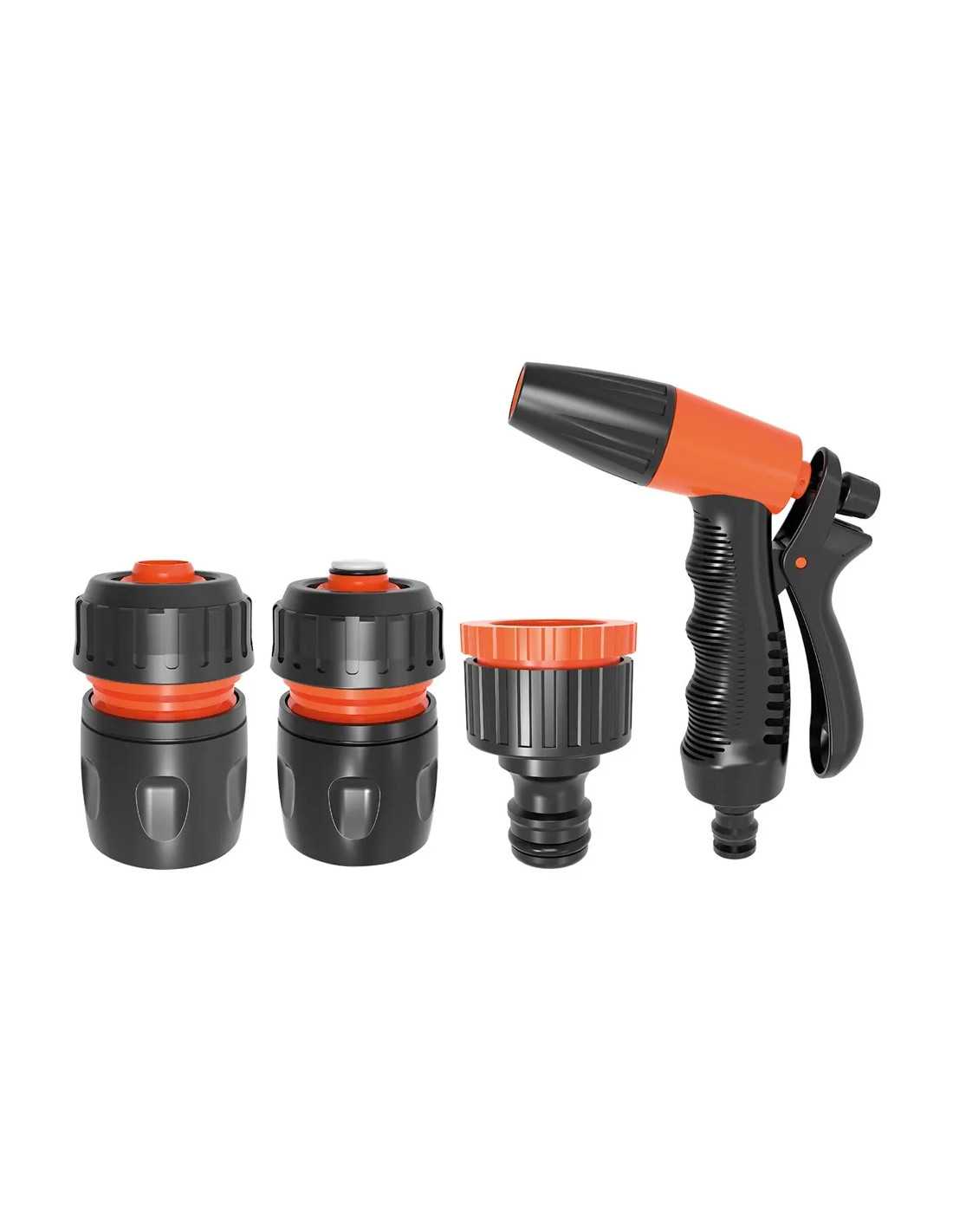 Questo kit include una pistola da giardino regolabile con impugnatura in gomma per un comfort ottimale durante l'uso. Inoltre, sono inclusi un pratico attacco a rubinetto 3/4' F con innesto, un raccordo rapido 1/2' e un raccordo rapido 1/2' acquastop per una facile connessione alle tubature dell'acqua.
