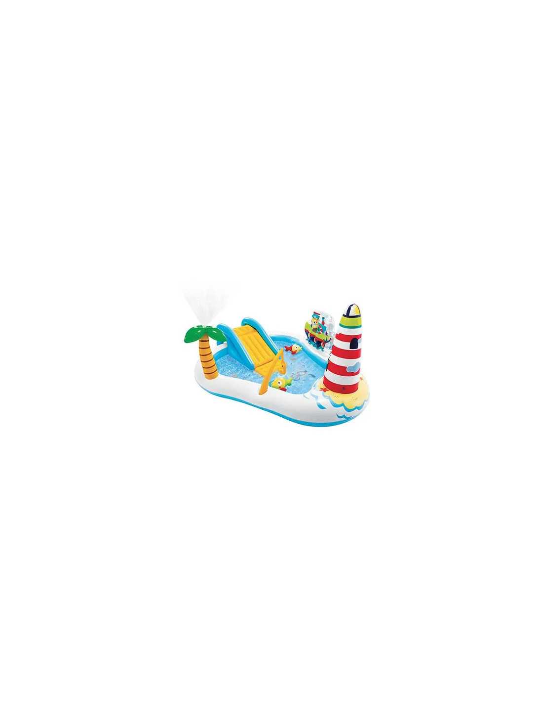 PLAYCENTER FISHING FUN 57162 INTEX è un divertente centro giochi gonfiabile in vinile di alta qualità, dotato di faro, palma con spruzzi d'acqua, scivolo, 2 pesci, 6 palline e canna da pesca gonfiabile. Ideale per ore di divertimento all'aria aperta!