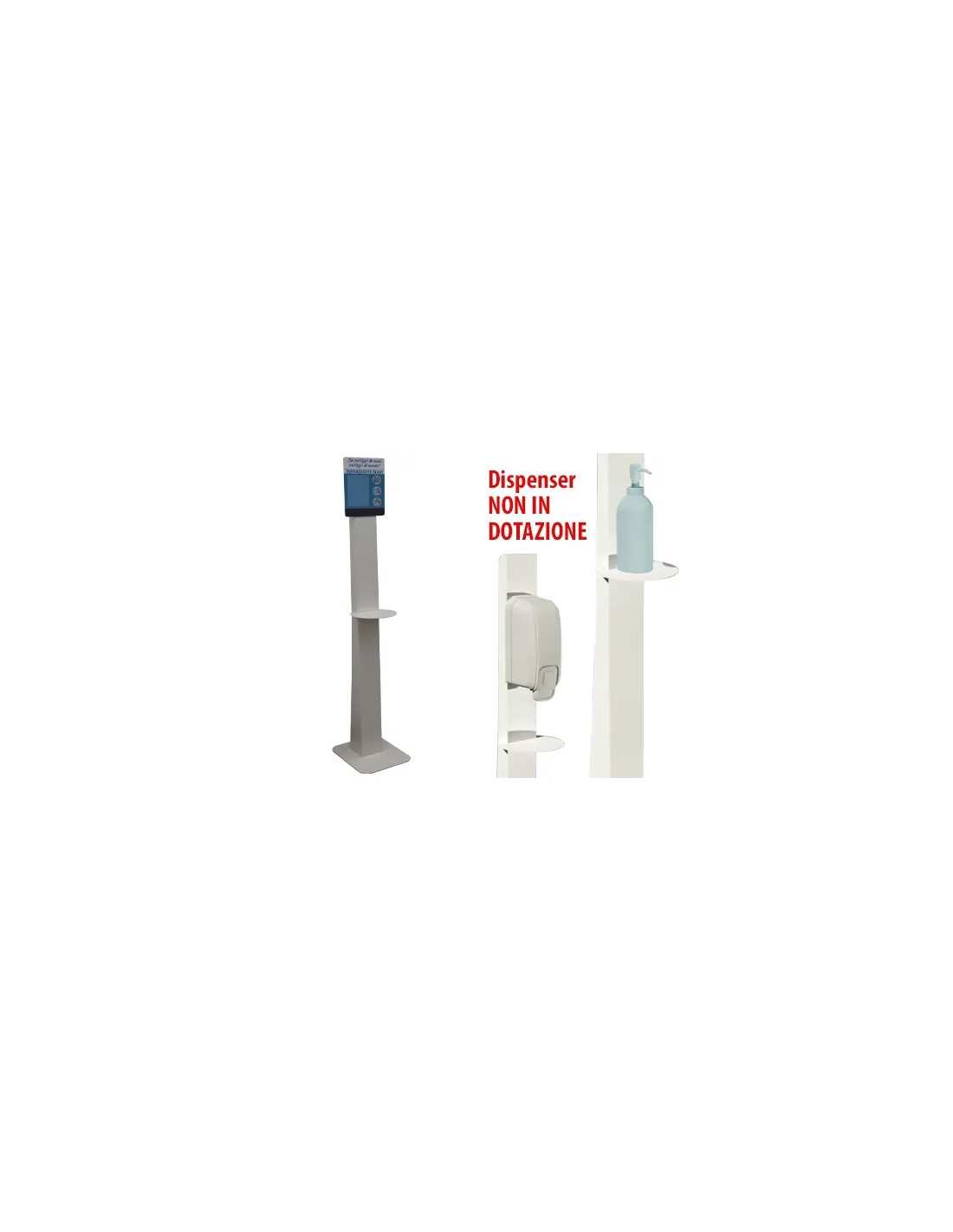 Porta dispenser igienizzanti a piantana Basic Simple, ideale per l'utilizzo in ambienti pubblici o commerciali. Realizzato in resistente lamiera verniciata, si adatta a dispenser automatici e manuali (non inclusi). Design minimalista e funzionale, perfetto per garantire igiene e praticità.