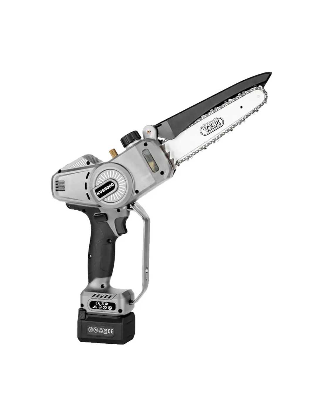Potatore a batteria 'KVS 6000' è l'attrezzo ideale per potare con precisione e facilità grazie alla sua impugnatura ergonomica e al motore brushless. Dotato di doppio interruttore di sicurezza, display per monitorare la carica residua e la temperatura, e catena con lubrificazione automatica.