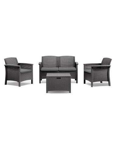 SET DA GIARDINO POLIPROPILENE 'VENEZIA II' è un elegante set per esterni realizzato in polipropilene effetto rattan, resistente alle intemperie e ai raggi UV. Il design moderno e robusto lo rende perfetto per chi cerca un prodotto durevole e di qualità. Il set include un tavolo rettangolare, due poltrone e un divano a due posti, completi di cuscini per un comfort ottimale.