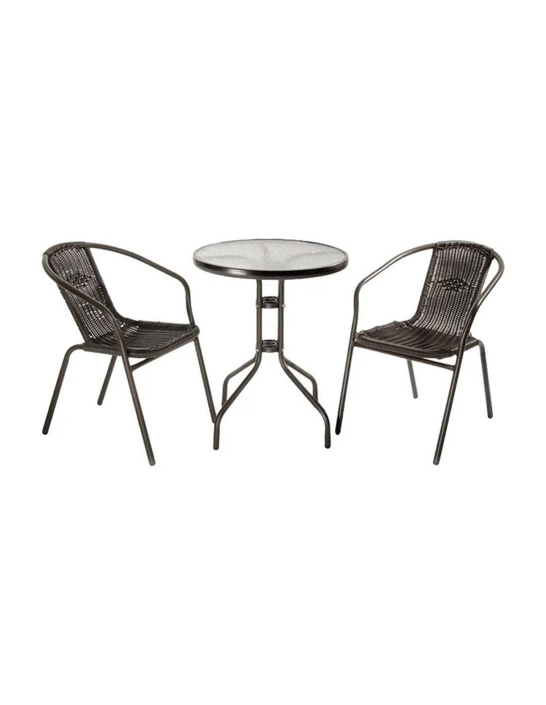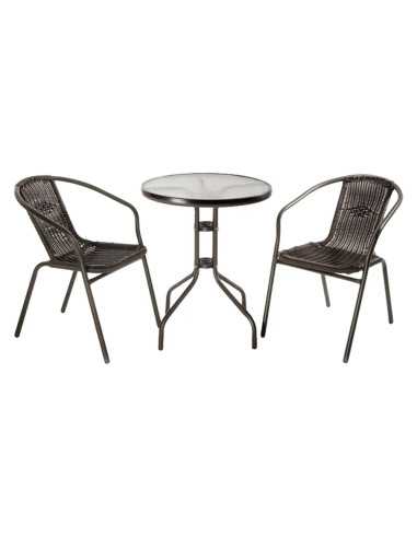 SET GIARDINO IN POLYRATTAN 'ACHILLE' è un elegante set composto da 2 sedie con braccioli e un tavolino tondo, perfetto per godersi momenti di relax all'aria aperta. Le sedie sono realizzate con struttura in metallo e seduta in polyrattan, mentre il tavolino ha un piano in vetro temperato. Un insieme di stile e comfort per il tuo giardino.