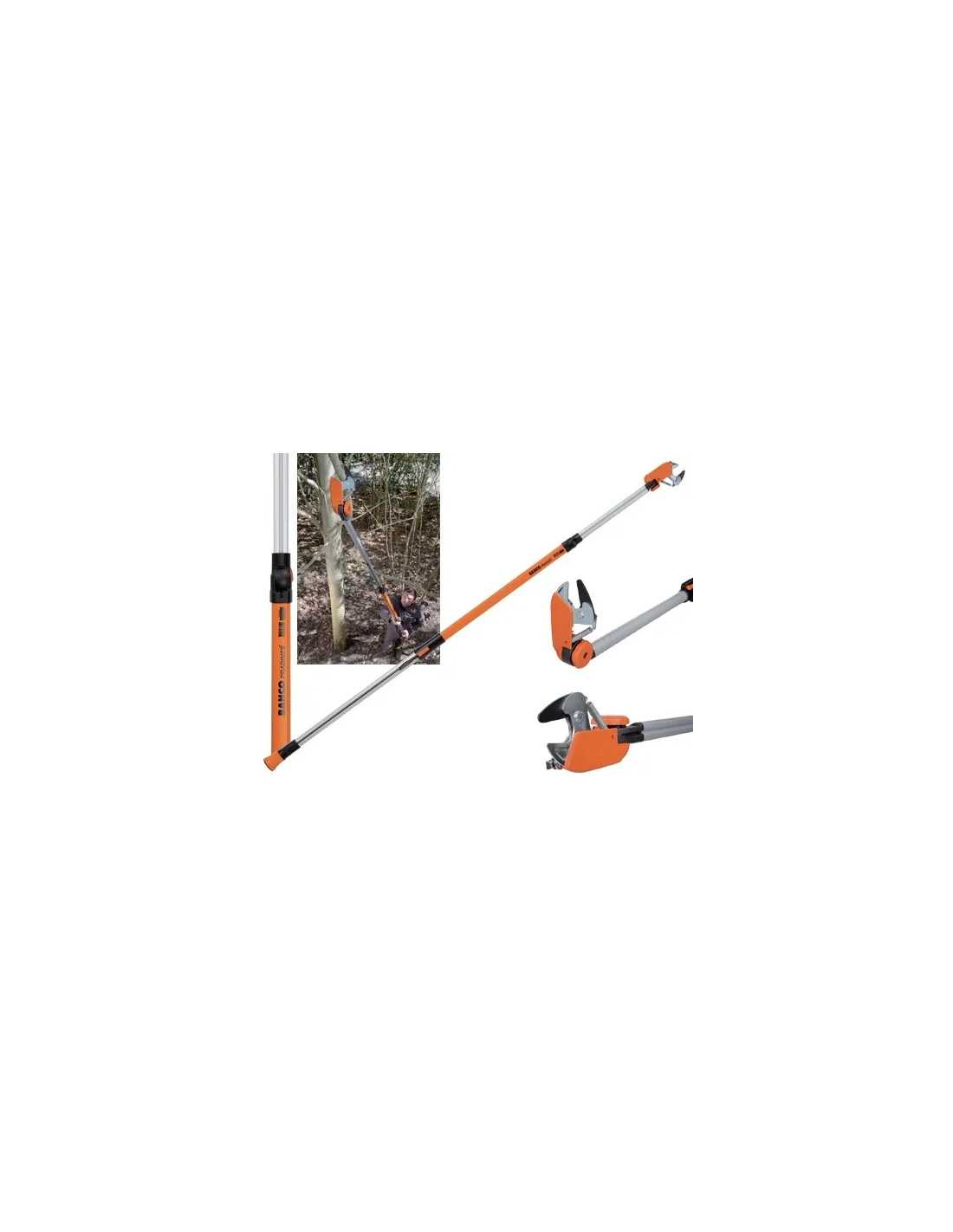 Svettatoio telescopico in alluminio con testa regolabile fino a 230° per tagliare rami fino a Ø 32 mm. Impugnatura scorrevole per massima potenza di taglio e impugnatura inferiore aggiuntiva per raggiungere altezze elevate.