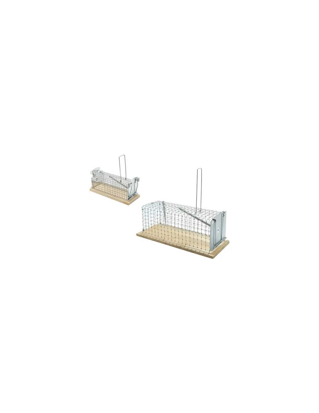 Trappole per topi a galleria con base in legno, realizzate in filo ferro zinco-cromato e dotate di ingresso singolo. Ideali per catturare topi in modo efficace e sicuro.