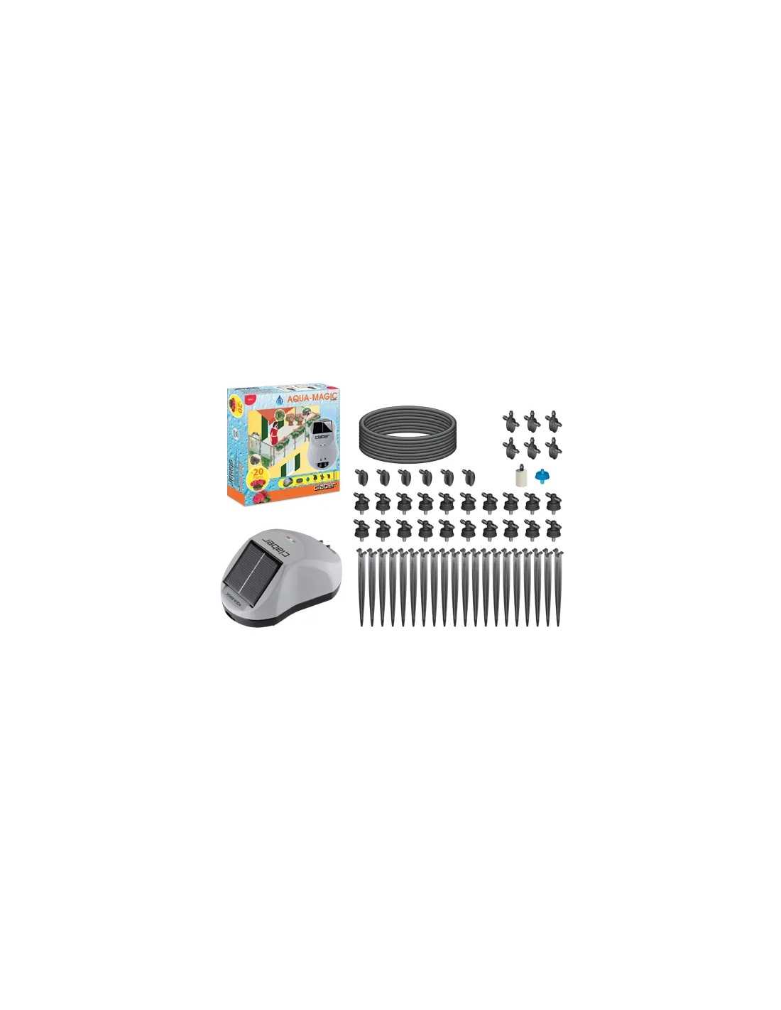 Kit Aqua-Magic Sistem Claber 8063 è un kit completo e pronto all’uso per impianto a goccia in terrazzo per 20 vasi. Totalmente indipendente dalla rete elettrica e idrica, include un programmatore-pompa solare, valvola anti-sifone, filtro di pescaggio, gocciolatori autocompensanti, tubo capillare e altro ancora.