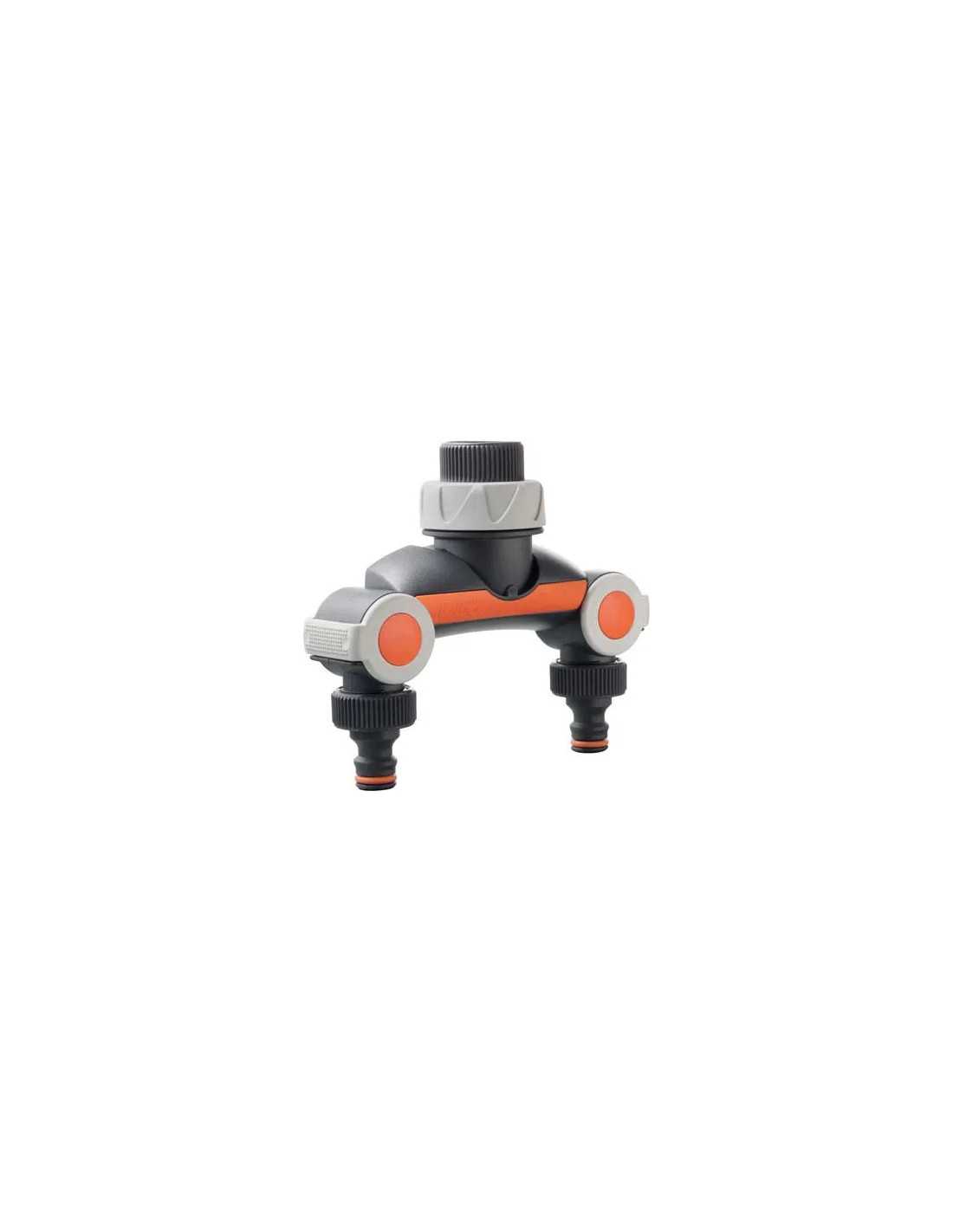 Una presa per rubinetti con doppia uscita, dotata di regolatore-modulatore di portata per ciascuna uscita per regolare il flusso. Include attacco rubinetto femmina e doppio innesto rapido al portagomma per una maggiore praticità.