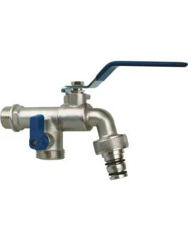 RUBINETTO A SFERA STARS con doppia uscita, ideale per collegare due tubi contemporaneamente. Dotato di attacco al muro filettato maschio da 1/2" e due uscite con valvola, una con innesto rapido al portagomma e l'altra con filettatura maschio da 3/4".