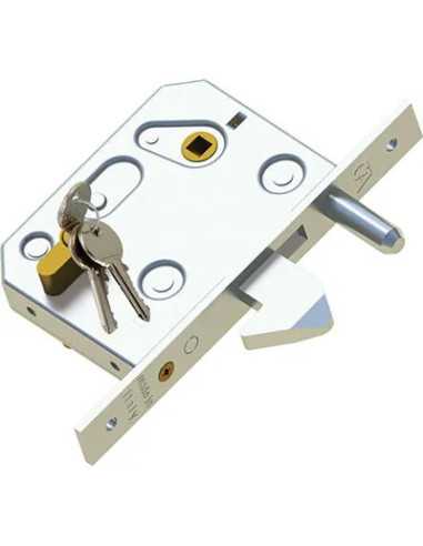 Serratura cancello infilare 350 COMBI con cilindro sagomato, chiusura a 1 mandata e mezzo giro e catenaccio a gancio con punta smussata. Dotata di frontale in acciaio zincato e 3 chiavi piatte incluse.