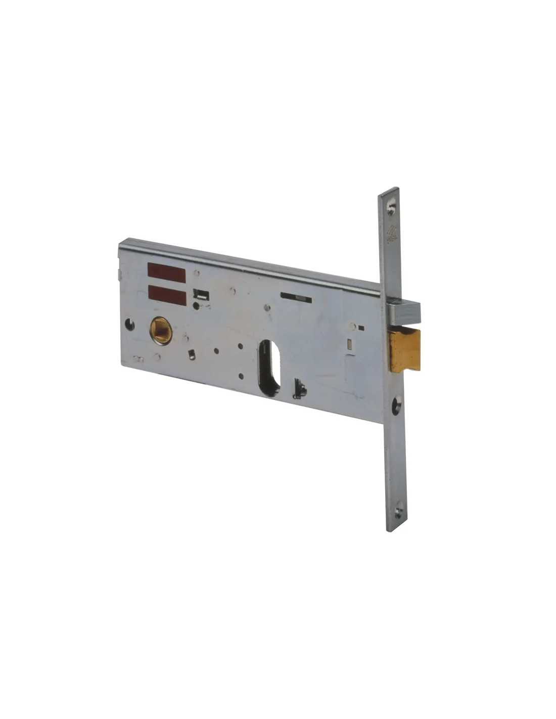 Serratura CISA Elettrica per montanti in alluminio, con scrocco autobloccante e fermo a giorno. Ideale per fasce zincate, senza contropiastra. Scatola da 64 mm, tensione 12 volt.