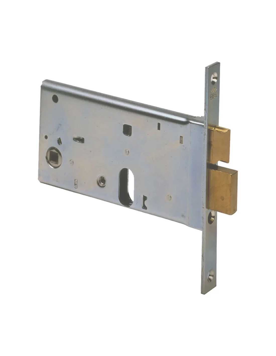 Serratura da infilare per fascia per alluminio della marca CISA, modello ART. 44460 E70, con foro cilindro europeo ovale, scrocco e catenaccio. Scatola e frontale zincato, scrocco in ottone, altezza scatola 77 mm, 2 mandate. Quadro maniglia mm 8, frontale 16 mm, interasse 67 mm. Dotata di vite di fissaggio cilindro. Cilindro non incluso.
