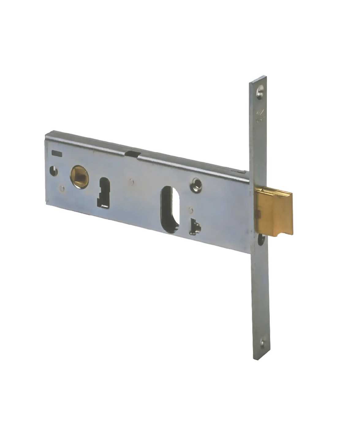 Serratura da infilare strettaper fascia per alluminio con foro cilindro europeo ovale, scrocco e catenaccio incorporato. Scatola e frontale zincato, scrocco in ottone. Altezza scatola 44 mm con 2 mandate. Dotata di quadro maniglia mm 8 e vite di fissaggio cilindro. Cilindro non incluso.