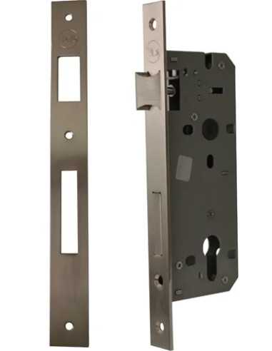Serratura Yale da infilare con catenaccio e scrocco reversibile, frontale in acciaio. Prodotto conforme alla normativa EN 12209:2003.