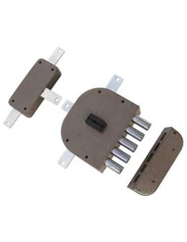 Serratura a doppia mappa con chiusura quintupla e catenaccio a 5 pistoni. Dotata di piastra corazzata e deviatore. Realizzata in acciaio verniciato. Include 3 chiavi e accessori per montaggio.