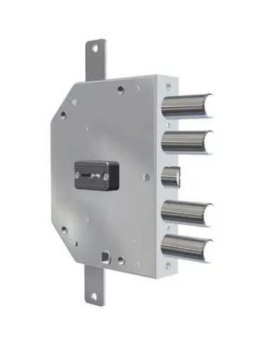 Serratura in metallo da applicare con scrocco azionabile da chiave o maniglia. Chiusura triplice con catenaccio a 4 pistoni e 4 mandate, predisposizione per chiusura aste. Realizzata in acciaio zincato, include 3 chiavi, 1 chiave da cantiere, mostrine e viti per il fissaggio.