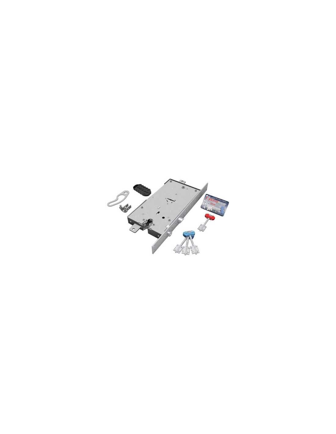 SERRATURA METALLO APPLICARE 2441 SECUREMME è dotata di un doppio sistema di chiusura con scrocco reversibile azionabile da chiave o maniglia. La parte superiore è controllata da doppia mappa a duplicazione protetta Securmap 24, che garantisce una chiusura sicura con catenaccio a 3 pistoni e 4 mandate. La parte inferiore è bloccata da un cilindro sagomato (non incluso). Questa serratura in acciaio zincato include 3 chiavi e 1 chiave di servizio.
