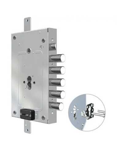 Serratura in metallo da applicare con doppio sistema di chiusura. Scrocco reversibile azionabile da chiave o maniglia. Composta da due parti: la parte superiore comandata da un cilindro sagomato che attiva una chiusura triplice con catenaccio a 4 pistoni e 2 mandate, e la parte inferiore comandata da doppia mappa che aziona un catenaccio a 1 pistone e 2 mandate. Realizzata in acciaio zincato e completa di accessori per il montaggio. Ideale per garantire sicurezza e protezione.