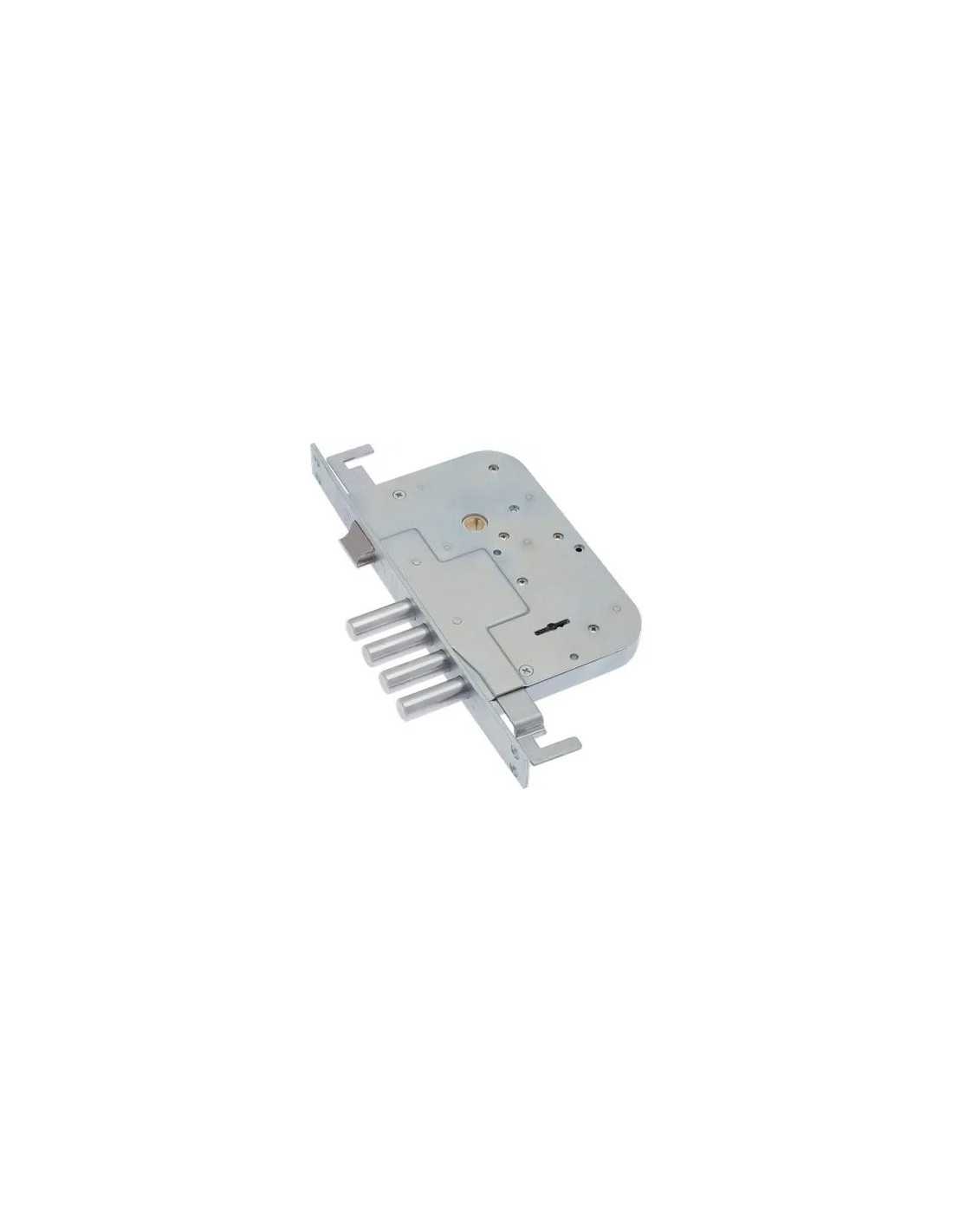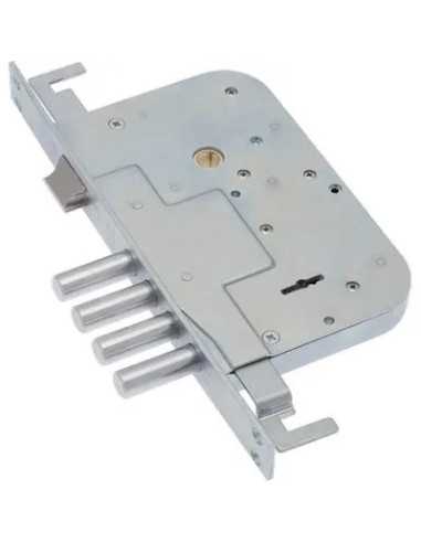 Serratura a doppia mappa con scrocco reversibile e chiusura triplice. Dotata di 4 catenacci a pioli a 4 mandate e frontale in acciaio zincato. Include 3 chiavi, bocchette copritoppa in ottone, contropiastra in acciaio zincato, viti di montaggio e pozzetto a pavimento.