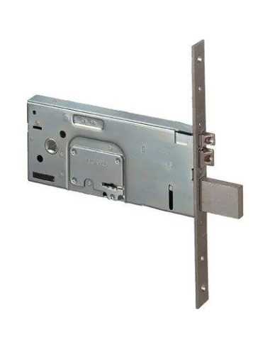 Serratura metallo infilare elettrica CISA, con fermo a giorno e scrocco autobloccante. Regolabile da 12mm a 18mm, chiusura con catenaccio a 4 mandate. Frontale in acciaio zincato con bordo quadro da 22x240mm. Altezza scatola 78mm. Include 2 bocchette per chiave e 3 chiavi.