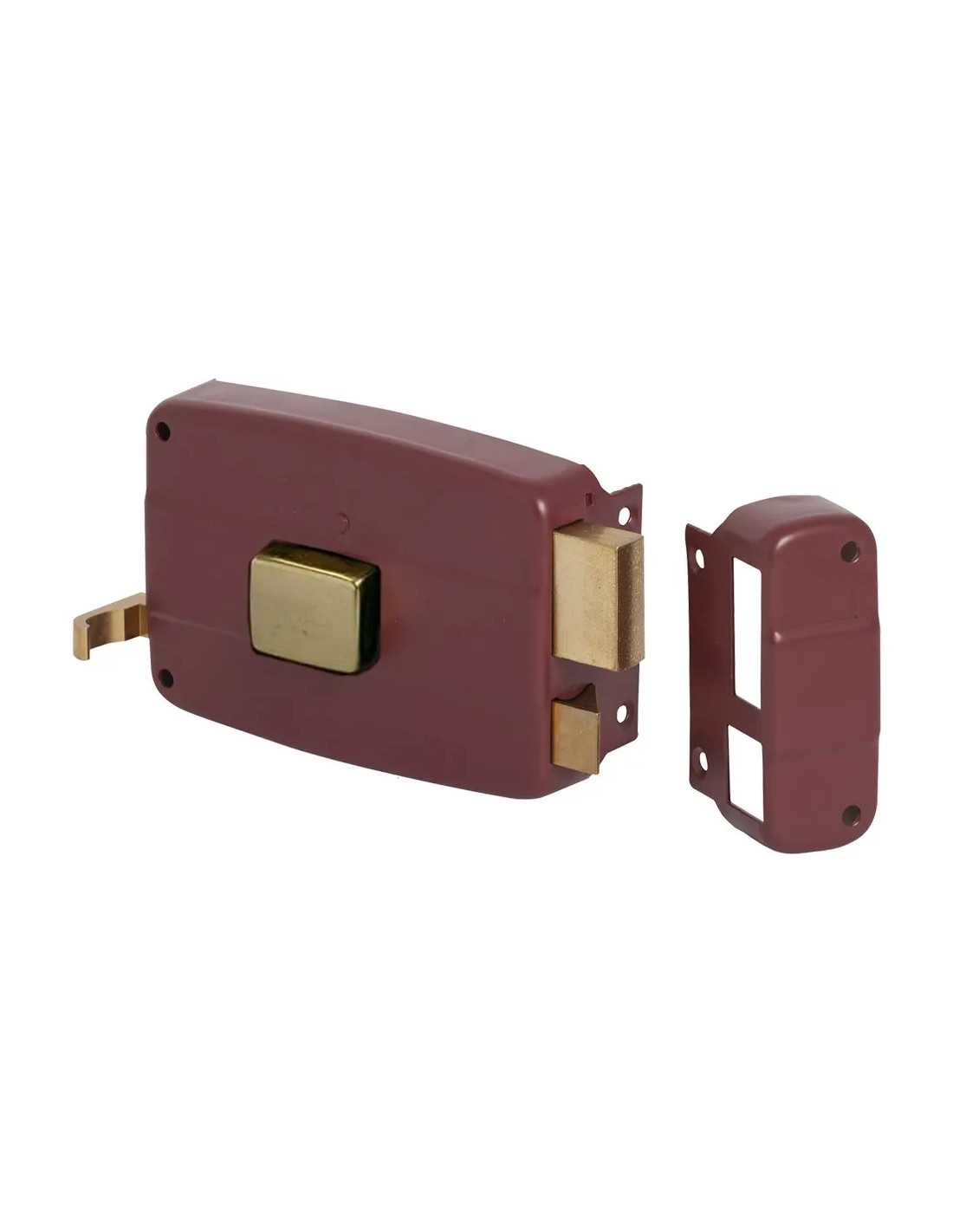 Serratura portoncino da applicare per legno con tirante e pomolo interno in ottone, scatola e bocchetta in acciaio verniciato rosso amaranto. Cilindro staccato esterno, scrocco e catenaccio separato in ottone. A 2 mandate. Dotata di 3 chiavi, bocchetta e vite di fissaggio.