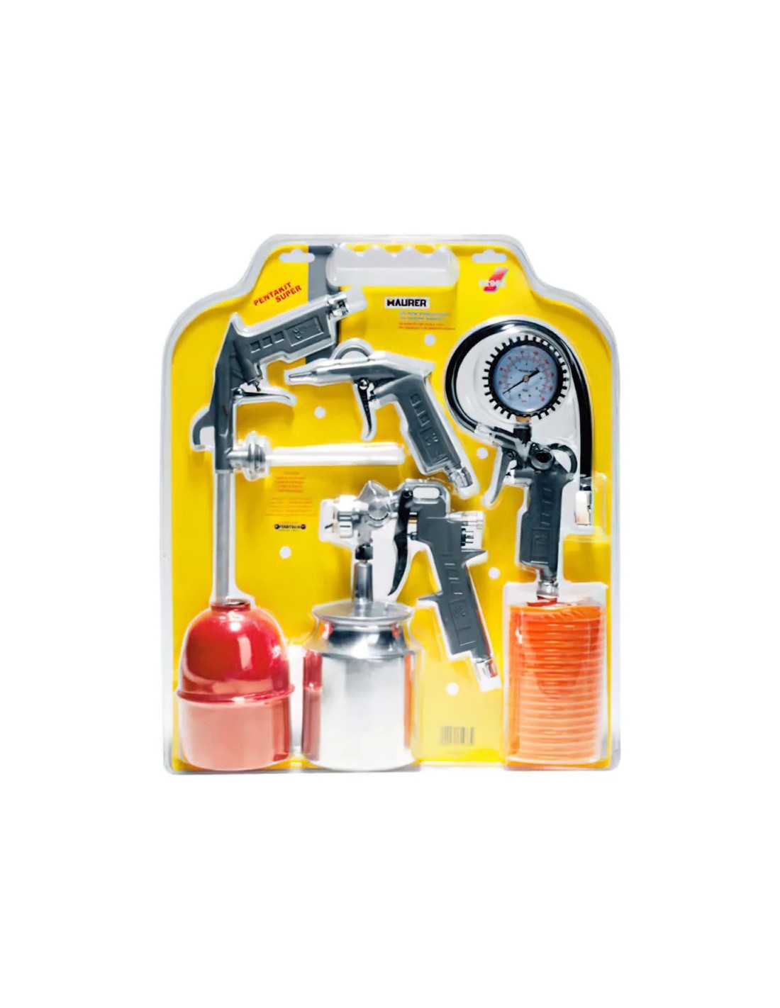 Il kit accessori compressore MAURER è composto da 5 pezzi essenziali per svolgere una varietà di lavori. Include una pistola soffiaggio, una pistola gonfiaggio con manometro, una pistola lavaggio, un aerografo con serbatoio inferiore e un tubo spiralato, tutti dotati di attacco rapido per una maggiore comodità. Confezionato in blister per una maggiore praticità.