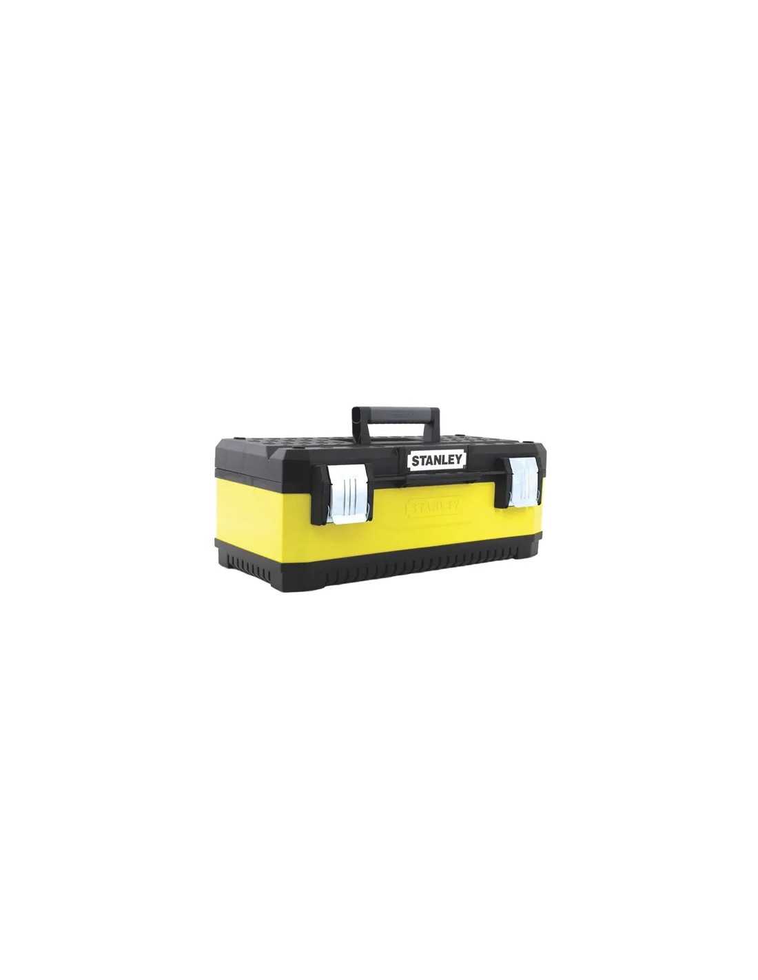 Cassette portautensili Stanley con corpo in metallo, vaschetta estraibile, coperchio con scanalatura a "V" per il taglio di assi, grandi cerniere anti ruggine con asola porta lucchetto e impugnatura ergonomica bi-material.