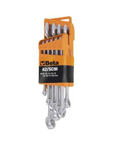 Chiavi combinate della serie 42/SC9I Beta, realizzate in acciaio cromato per una maggiore durabilità. La serie include chiavi di diverse misure, con supporto compatto in plastica resistente e appendibile per un comodo trasporto e conservazione.